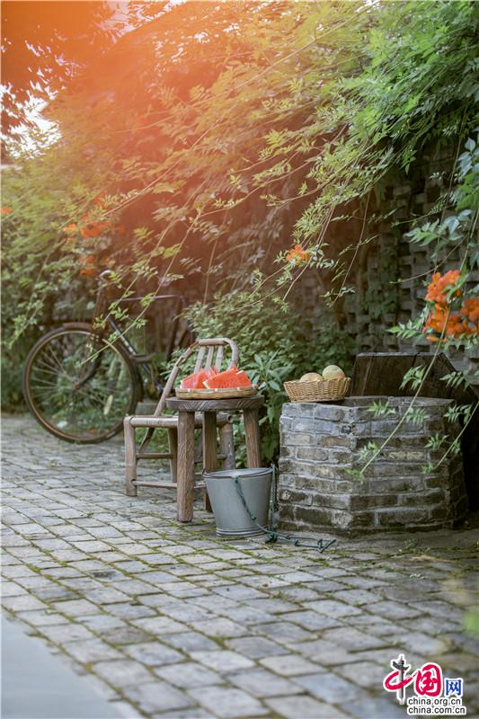 一縷陽(yáng)光從藤蔓間落下,微風(fēng)激醒了夏日的小院、水井、西瓜、竹椅......自然與肌理糅合陶然入夏。香村的一切,無(wú)一不村野,無(wú)一不夏天。
