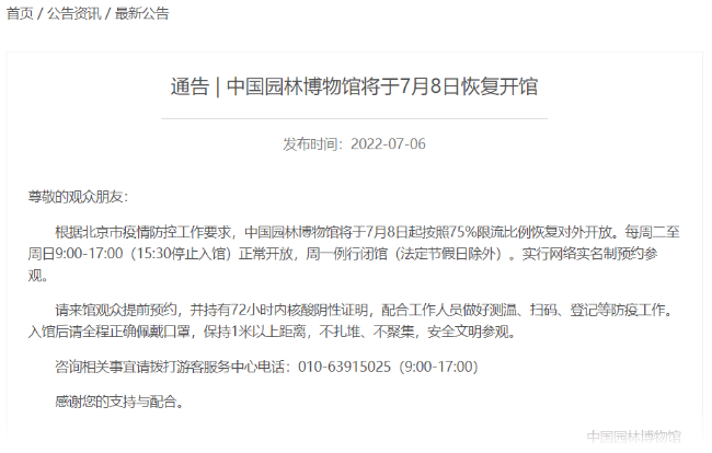 中國園林博物館發(fā)布最新消息,根據(jù)北京市疫情防控工作要求,中國園林博物館7月8日起按照75%限流比例恢復對外開放。