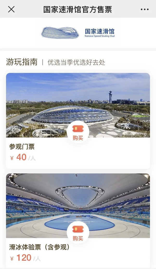 來(lái)這里參觀可以通過(guò)微信關(guān)注“國(guó)家速滑館”公眾號(hào)進(jìn)行票務(wù)預(yù)約。參觀門(mén)票40元每人次。參觀加上冰的套票120元每人次。根據(jù)游客需求,也可以現(xiàn)場(chǎng)購(gòu)買(mǎi)80元每人次的滑冰體驗(yàn)票,其中包含了90分鐘的滑冰體驗(yàn)和一套冰鞋一套護(hù)具。