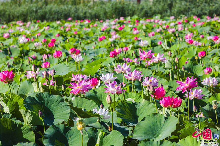 七八月份,正是荷花競相盛開的季節(jié),寧夏沙湖景區(qū)利用淺灘和鹽堿地種植觀賞性荷花,在湖東游線深處打造了西北沙漠旁的“萬畝荷花苑”,為景區(qū)夏日增添一抹韻味。成片的荷花在西北的驕陽下熠熠生輝,構成“接天蓮葉無窮碧”的塞上秀美荷塘景觀。