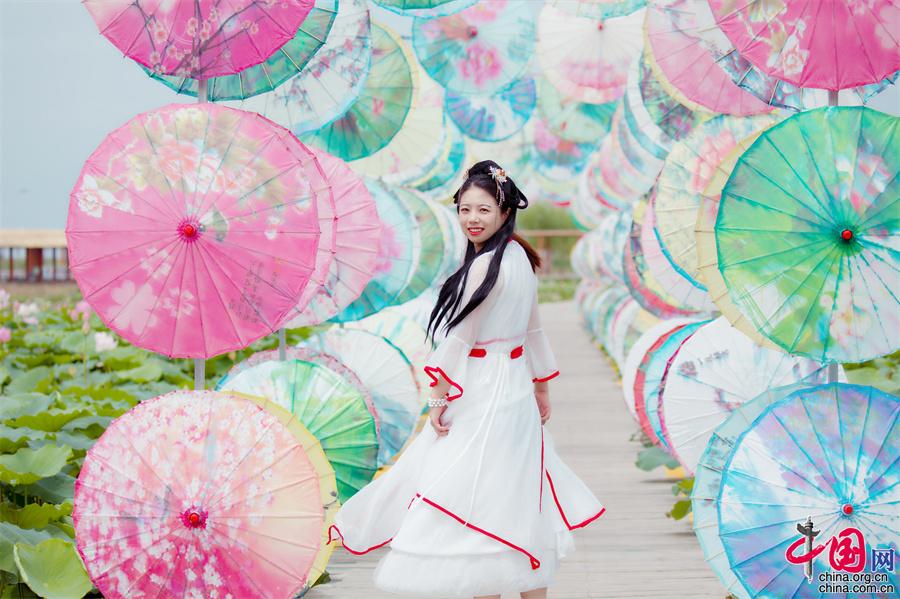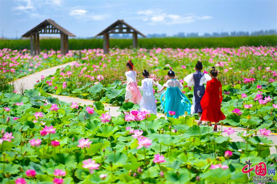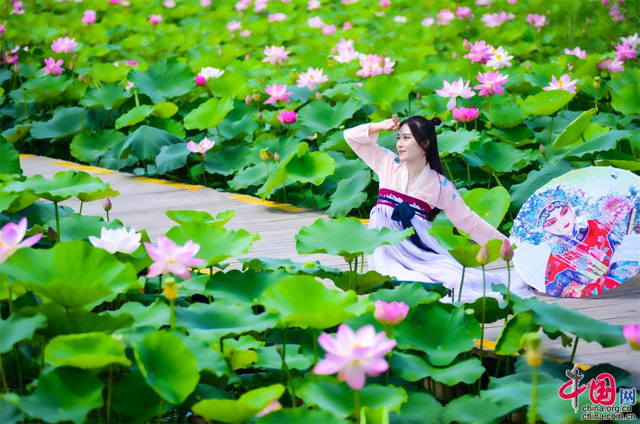 寧夏沙湖: 接天蓮葉無窮碧 國風漢服映荷塘(圖)