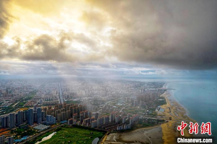 圖為陽光穿過云層照耀北海市城區(qū)。 徐紹榮 攝