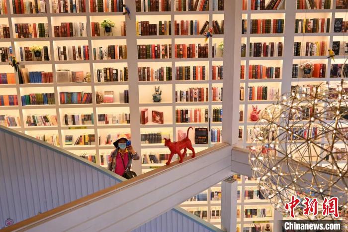 圖為貓主題書(shū)店書(shū)墻?!⑽娜A 攝