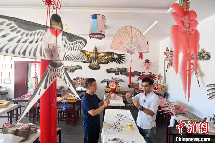 巴基斯坦籍留學(xué)生烏瑪爾(右)跟隨第什里風(fēng)箏第五代傳承人趙艷強(左)學(xué)習(xí)傳統(tǒng)風(fēng)箏制作?!〉杂鸺?nbsp;攝