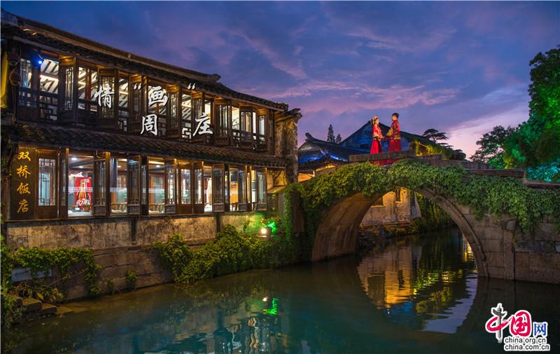 雙橋如畫(huà),入畫(huà)周莊。牛郎織女七夕鵲橋相會(huì),而我與你邂逅在江南水鄉(xiāng)。人間煙火至,攜手水鄉(xiāng)游,夜色下隱隱約約的古橋,仿佛是叩響幸福之門(mén)的鑰匙,溫柔靜默,流淌著時(shí)光,好似走過(guò),便可白頭偕老。