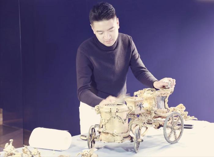 “這件‘魔術(shù)人鐘’功能比較復雜,經(jīng)過長期開動后,出現(xiàn)了一點故障,就存放在了庫房。”亓昊楠說,自己和師父王津一起修復這座鐘表時,才發(fā)現(xiàn)它的內(nèi)部系統(tǒng)有多精細。