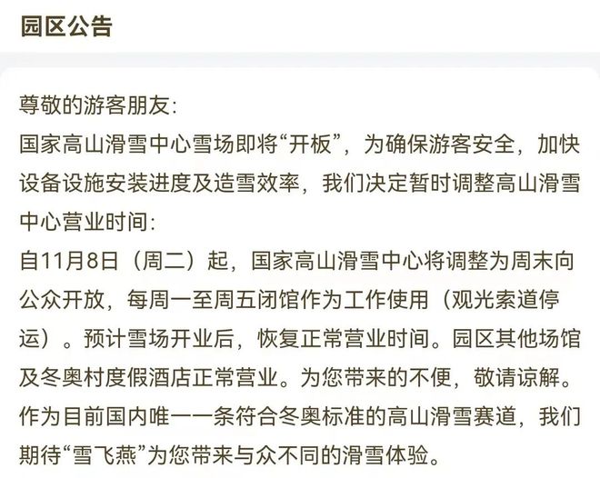 根據(jù)公告,自11月8日(周二)起,國(guó)家高山滑雪中心將調(diào)整為周末向公眾開放,每周一至周五閉館作為工作使用(觀光索道停運(yùn))。預(yù)計(jì)雪場(chǎng)開業(yè)后,恢復(fù)正常營(yíng)業(yè)時(shí)間。目前,“雪飛燕”已對(duì)外開放,如果纜車開放,便可以乘坐纜車上到山頂。
