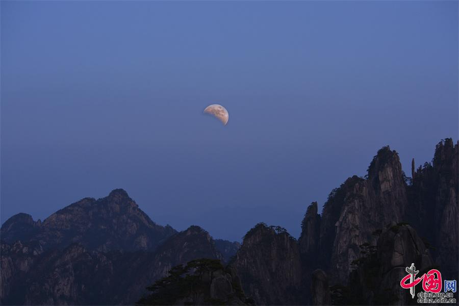 2022年11月8日晚,黃山之巔的群峰上出現(xiàn)的月全食景觀,給美麗的黃山增添一道美輪美奐的風景。