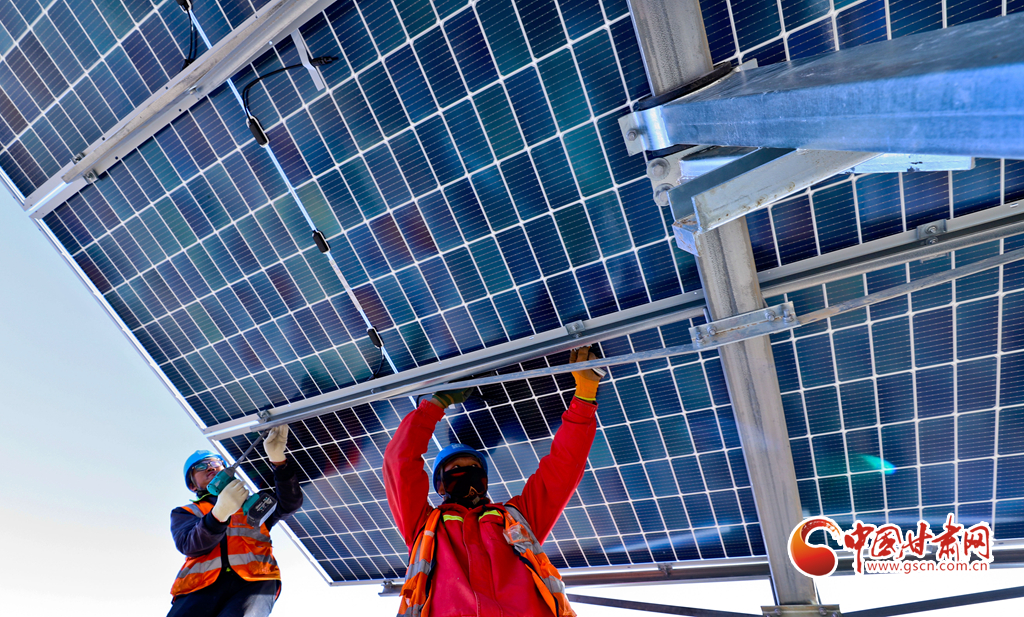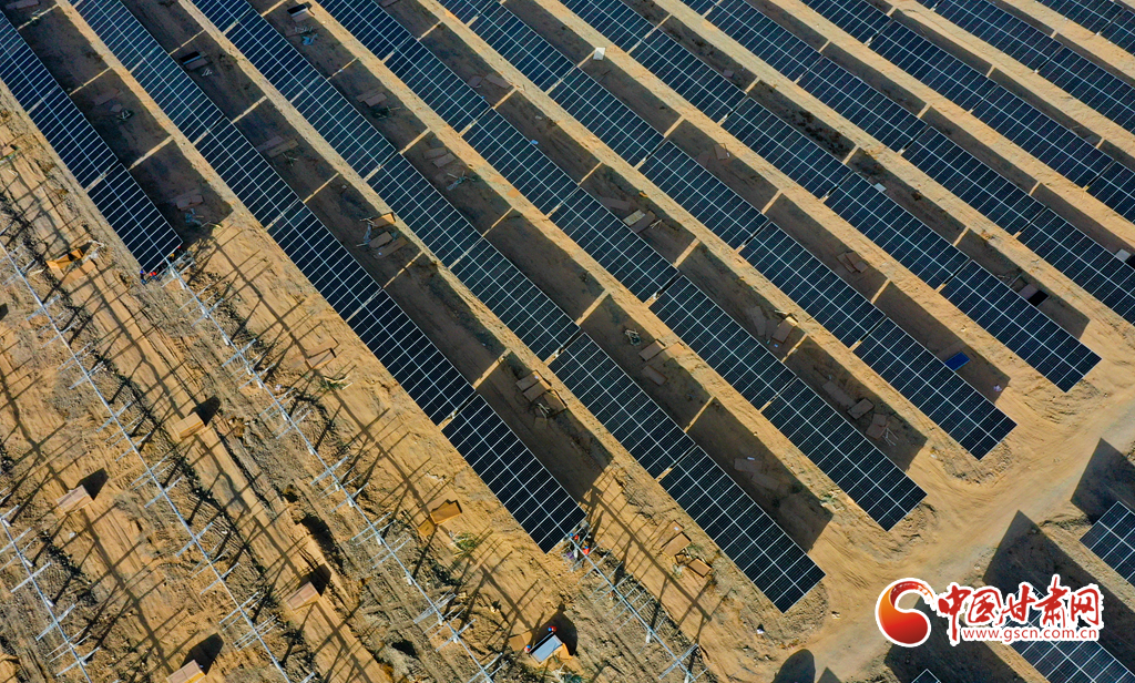 11月17日,甘肅省張掖市甘州區(qū)南灘中能綠電南灘30萬千瓦光伏建設現(xiàn)場,工人們正在安裝光伏板。