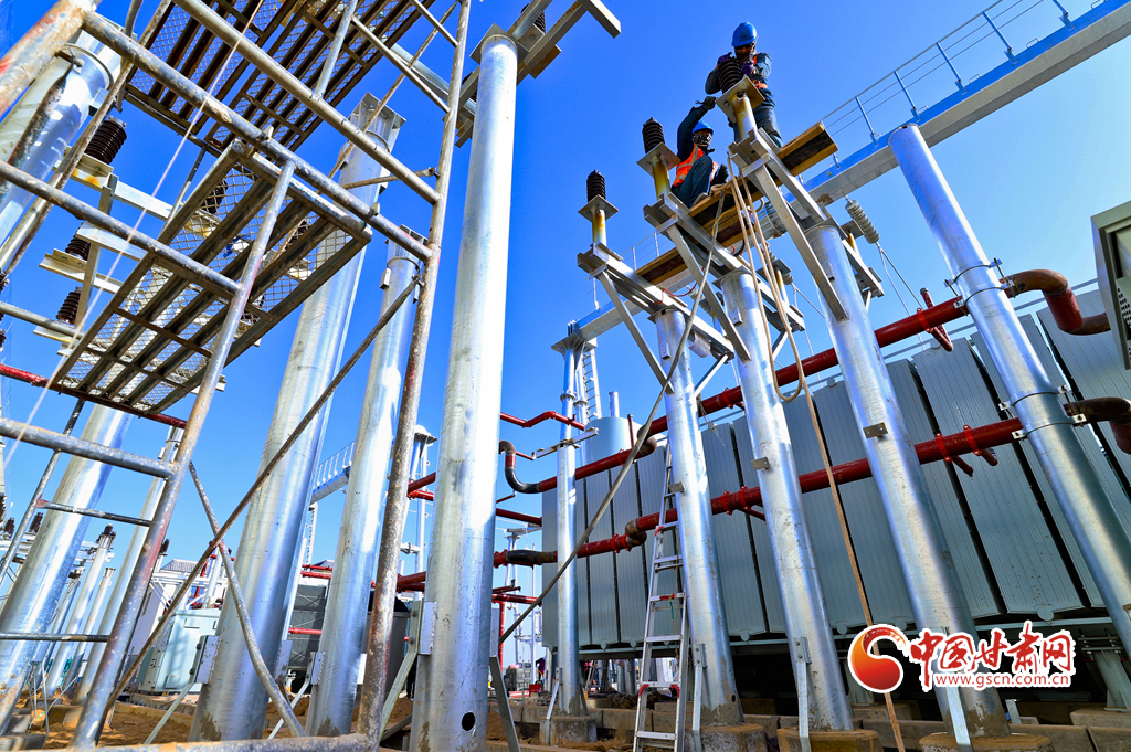 11月17日,甘肅省張掖市甘州區(qū)南灘中能綠電南灘30萬千瓦光伏建設現(xiàn)場,工人們正在進行變電設備安裝。