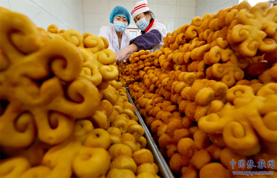 1月10日,張掖市山丹縣隴圓食品加工坊饃饃制作車(chē)間里,工作人員正在緊張忙碌著將制作好的“糖花子”放入冷卻盤(pán)中。