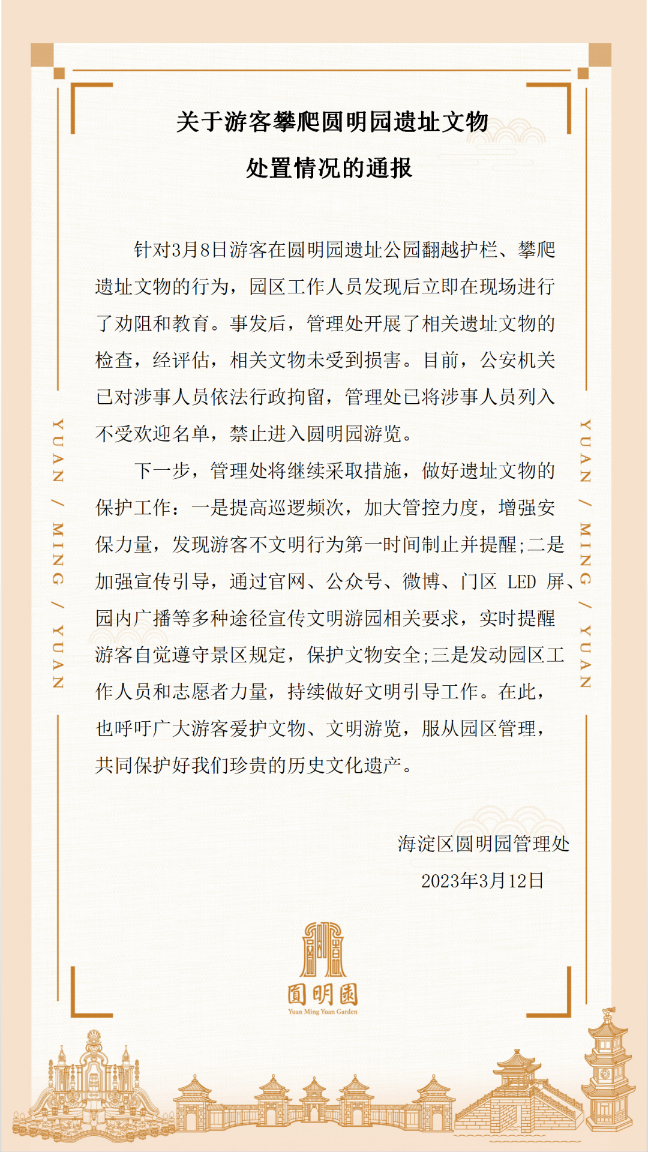 《通報(bào)》指出,針對(duì)3月8日游客在圓明園遺址公園翻越護(hù)欄、攀爬遺址文物的行為,園區(qū)工作人員發(fā)現(xiàn)后立即在現(xiàn)場(chǎng)進(jìn)行了勸阻和教育。事發(fā)后,管理處開(kāi)展了相關(guān)遺址文物的檢查,經(jīng)評(píng)估,相關(guān)文物未受到損害。目前,公安機(jī)關(guān)已對(duì)涉事人員依法行政拘留,管理處已將涉事人員列入不受歡迎名單,禁止進(jìn)入圓明園游覽。