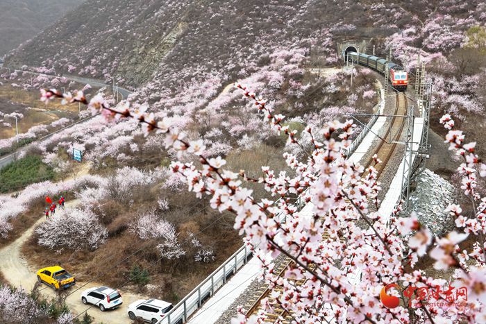 陽春三月,桃之夭夭。在崇信縣的漫山遍野上,朵朵桃花迎來盛放期。微風吹來,暗香浮動。近看,朵朵嬌俏的桃花層層疊疊,錯落有致。遠看,漫山紅遍如霞似錦,爛漫壯觀。特別是一列列火車穿行而過,與桃花撞了個滿懷,奔向充滿希望的春天。