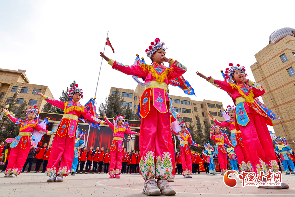 3月22日,在甘肅省張掖市民樂縣洪水小學(xué),戲曲演員正在給同學(xué)們指導(dǎo)戲曲動作、傳授唱腔。