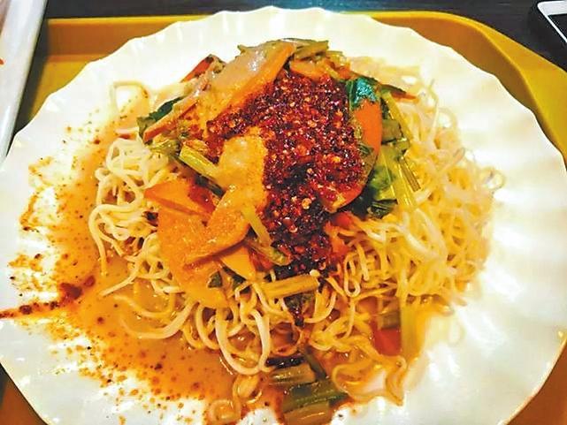 涼州涼面挑起來(lái)筋道,落在碗里松松散散,黃澄澄的像一窩金絲,澆一勺醋鹵,更是錦上添花。