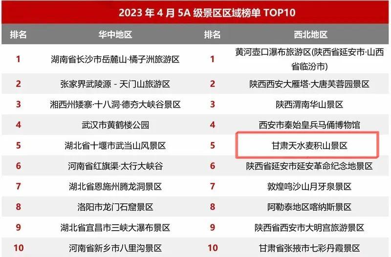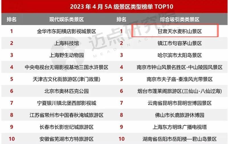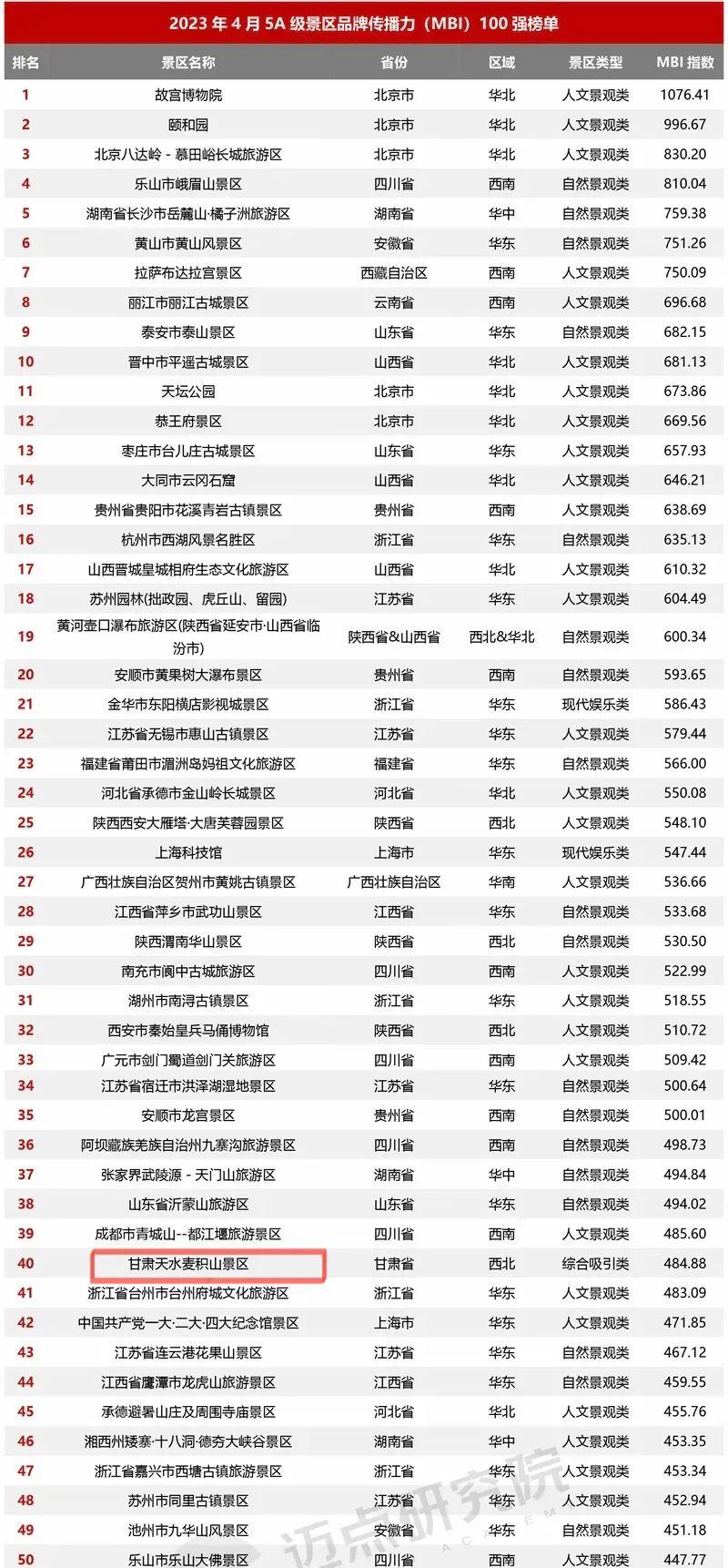 2023年4月5A級(jí)景區(qū)品牌傳播力100強(qiáng)榜單上,熱烈祝賀麥積山景區(qū)榮登國(guó)內(nèi)文旅行業(yè)最具影響力的權(quán)威數(shù)據(jù)分析機(jī)構(gòu)“邁點(diǎn)研究院”4月5A級(jí)旅游景區(qū)品牌傳播力百?gòu)?qiáng)榜單前五十和綜合類旅游景區(qū)第一、西北地區(qū)分項(xiàng)榜單第五。
