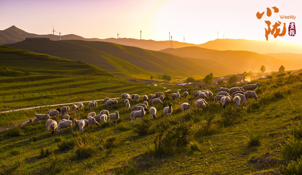 夕陽西下,草原,房屋,羊群,山脈……融為一體,猶如一幅淡墨山水畫躍然紙上,熠熠生輝。