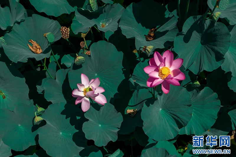 近日,在甘肅省白銀市白銀區(qū)水川黃河濕地公園,滿池荷花嬌艷、荷葉青翠,藍(lán)天、碧水、嬌花、翠葉構(gòu)成了一幅秋日美景圖。新華網(wǎng)發(fā)(郭宏 攝)