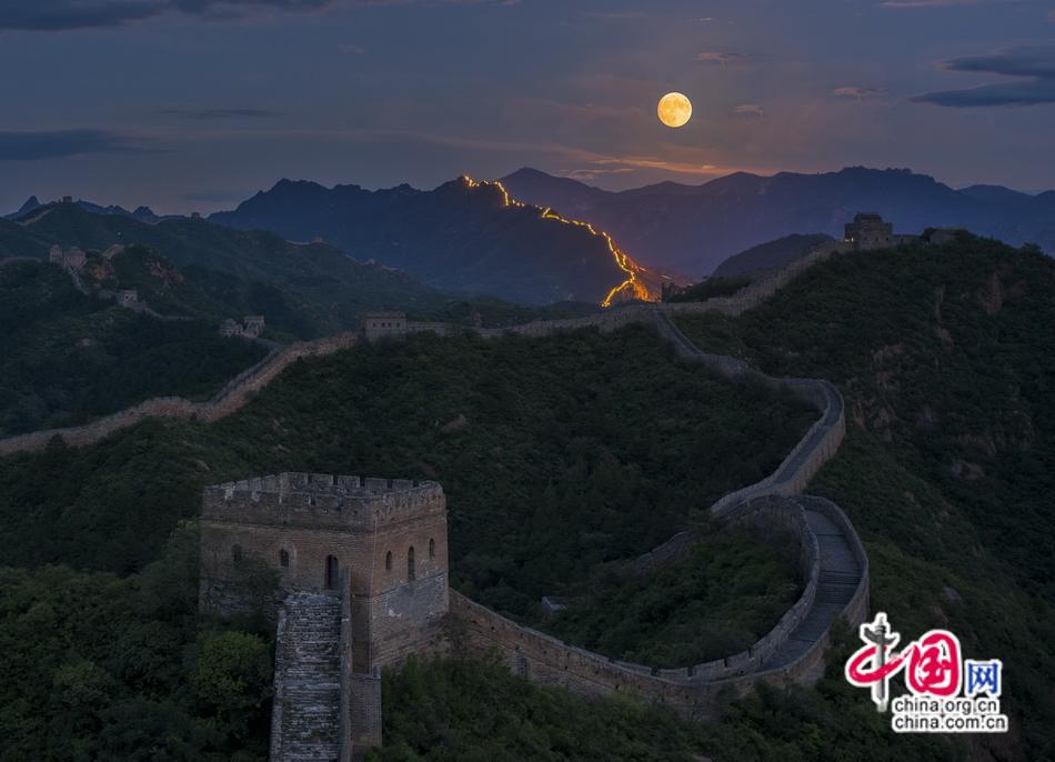 初秋的金山嶺長城在超級(jí)月亮的映襯下,更顯得神秘而壯美。金山嶺長城的雄偉壯觀和自然界的美妙令人難忘。