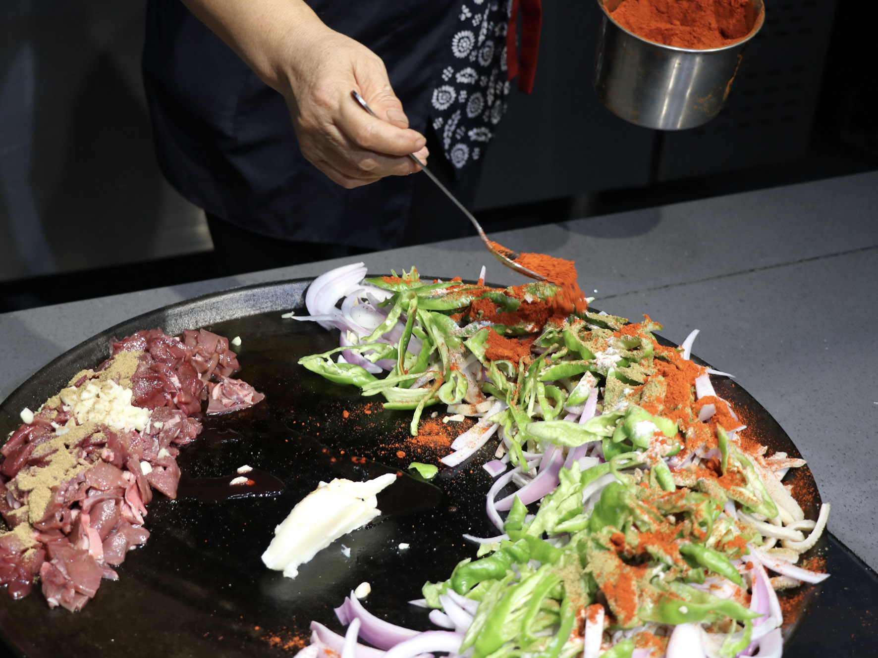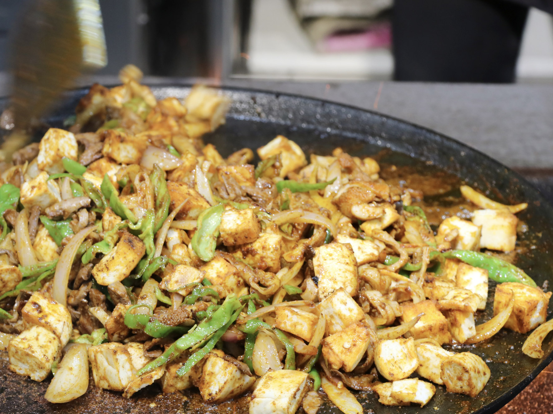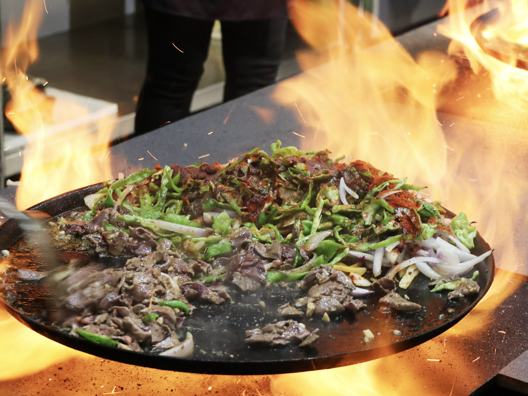 最美味的食物往往來自于最樸素的食材,只見店家將切好的羊肝、肺、肚、腸、心等佐以洋蔥、青椒下入一個鑄鐵鏊子里,再加上幾勺鹽和辣椒面,開始用猛火爆炒,火星四濺,一頓撥拉之后,待到七分熟左右再放入提前準(zhǔn)備好的白餅塊一起翻炒即可。
