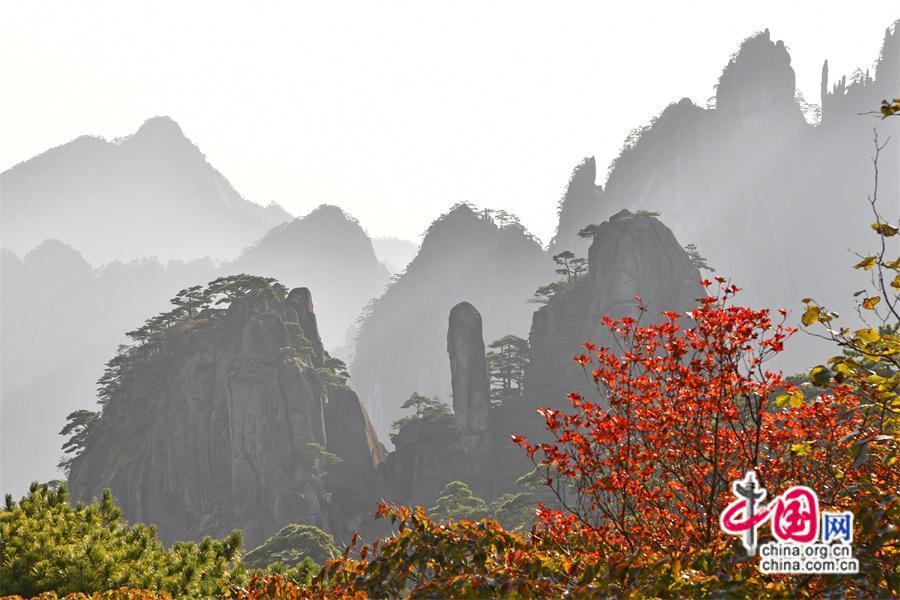 秋日黃山,雨后放晴最為嫵媚。蔚藍(lán)色的天空一塵不染,山間綿連不斷的云海,時(shí)而像海浪在空中翻滾,擁擠著、碰撞著,時(shí)而像一匹白紗綢緞,環(huán)繞在山巔上、飄散在松林間,只見黃山的紅葉點(diǎn)點(diǎn)散落,紅綠相間,與峻峭山峰、藍(lán)天云海、奇松怪石,精致婉約地繪成一幅幅五顏六色的山林畫卷,正是登游好時(shí)節(jié)。(姚育青)