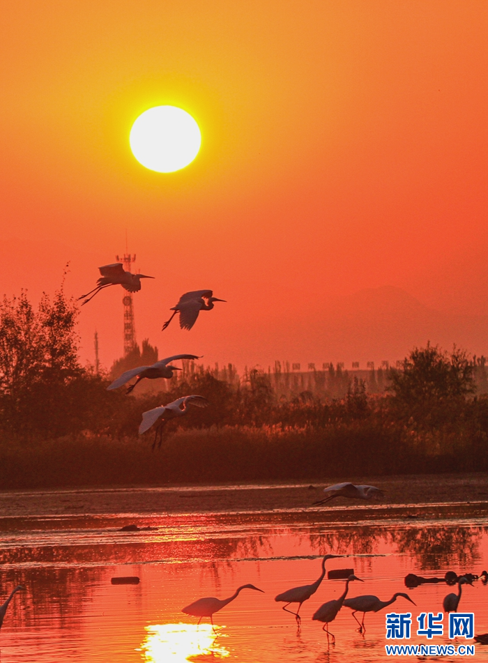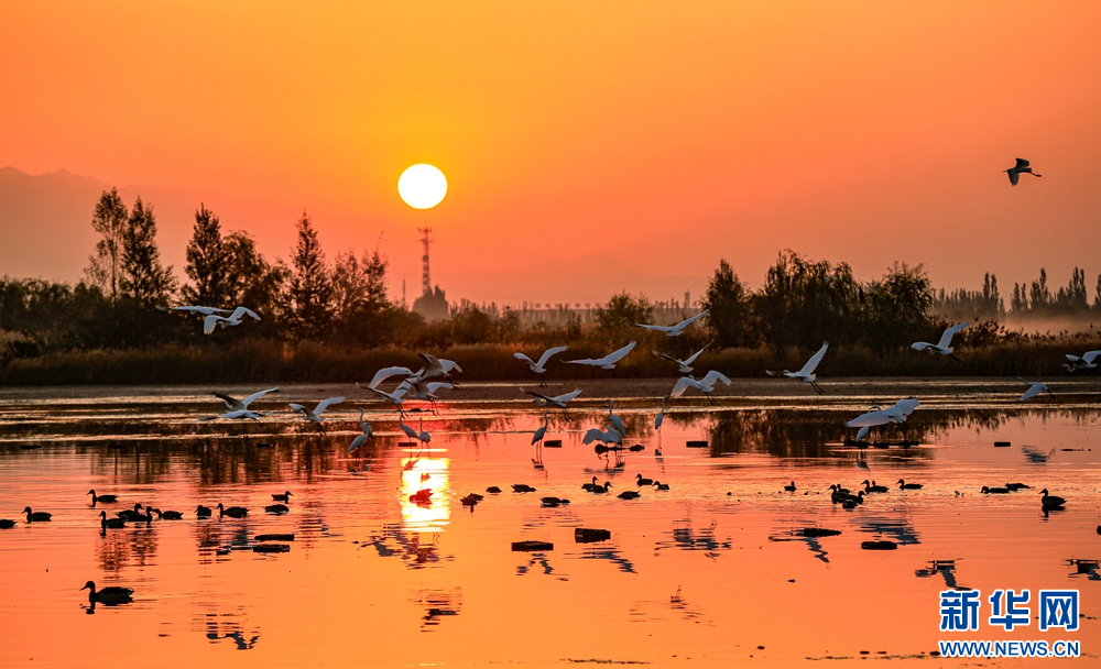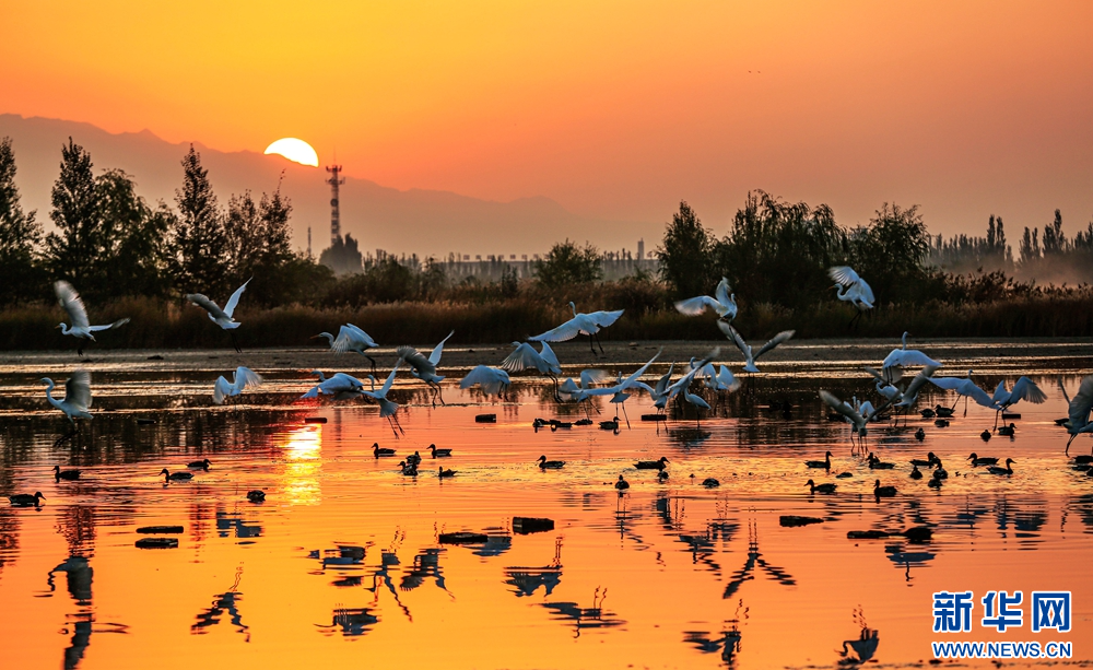 近日,在甘肅省張掖國(guó)家濕地公園,成群的白鷺迎著朝陽(yáng)悠然自得地飛翔、覓食、嬉戲,構(gòu)成了一幅朝陽(yáng)伴鷺飛的美麗畫卷。新華網(wǎng)發(fā)(陳禮 攝)