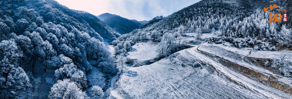走進(jìn)關(guān)山,看到的是一個(gè)神話般的雪韻凇情美景,霧凇結(jié)在樹(shù)上,亮晶晶的猶如一根根銀條,浪漫唯美,別有韻味。