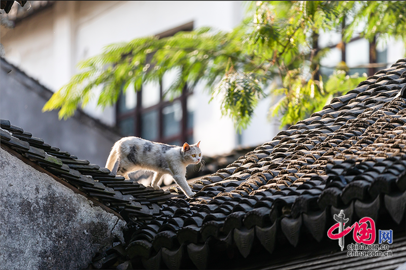 在毛孩子眼里,這就是包容一切活動(dòng)的「游樂(lè)場(chǎng)」,片片青瓦上留下梅花印?;蛟S你也該往古鎮(zhèn)的屋頂上瞧,檐角翹伸、清風(fēng)古韻,讓人心曠神迷?;蛲侵回堃粯优噬细咛?,推窗看那水那橋,那木門青瓦,就是江南水鄉(xiāng)的具象。