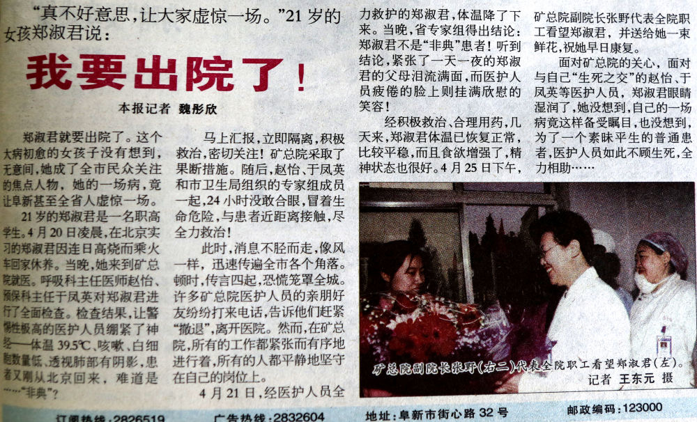 作為部門領(lǐng)導(dǎo),她依然表現(xiàn)出色,2003年“非典”期間,她擔(dān)任阜新晚報要聞部主任,她提出“最危險的地方,我先上!”4月20日,有一個學(xué)生從北京回來,因為高燒不退被懷疑為感染“非典”,一時間謠言四起,恐慌籠罩全城,魏彤欣一個人冒著風(fēng)險深入醫(yī)院跟蹤采訪,在得知確診不是“非典”后,第一時間發(fā)出了報道《我要出院了》,及時消除了公眾恐慌情緒。她帶領(lǐng)記者深入發(fā)熱門診、城市出入口的檢查站和醫(yī)護人員之間,掌握了大量的一手材料,共采寫了70余篇稿件,她本人被評為“遼寧省抗擊非典新聞宣傳先進個人”,她所在的部門被評為“遼寧省抗擊非典新聞宣傳先進集體”。