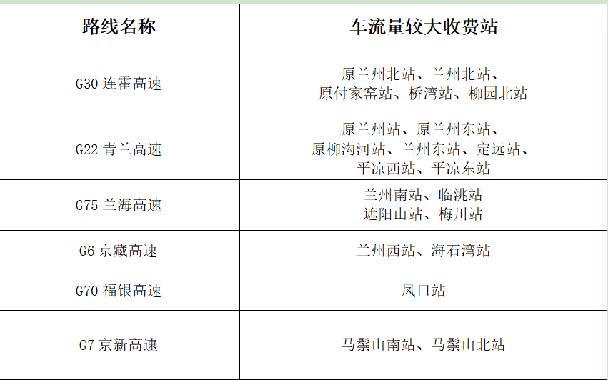 (一)高速公路重點(diǎn)路段。以蘭州為中心的放射線及其聯(lián)絡(luò)線為重點(diǎn)。如:G30連霍高速,G22青蘭高速,G6京藏高速,G70福銀高速,G75蘭海高速,S1機(jī)場(chǎng)高速等路段及相關(guān)收費(fèi)站、服務(wù)區(qū)。