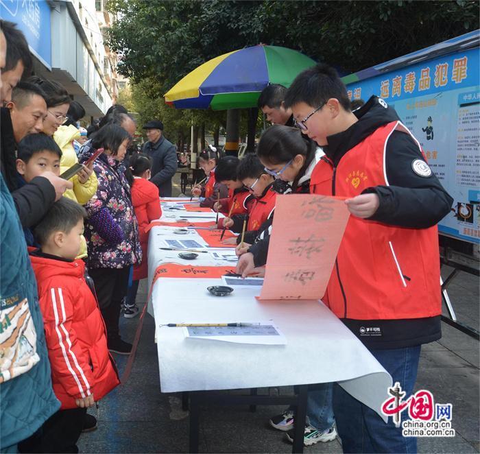 1月27日,湖南省新邵縣書法家協(xié)會主席陳志龍帶領10余名身穿紅馬甲的小學生書法愛好者,來到該縣農貿市場前坪中心,開展“寫春聯(lián)、送春福”公益活動。