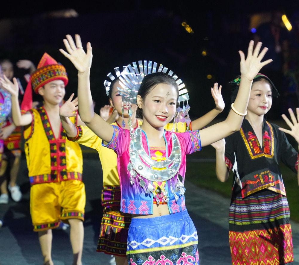 ↑2023年9月16日,海南省五指山市民族時裝“村秀”系列文化活動開幕。鄉(xiāng)鎮(zhèn)居民身著黎族、苗族傳統(tǒng)和創(chuàng)新設計服飾,向人們展示民族傳統(tǒng)文化的魅力。圖為展示服裝的小朋友與觀眾互動。新華社記者 樊雨晴 攝