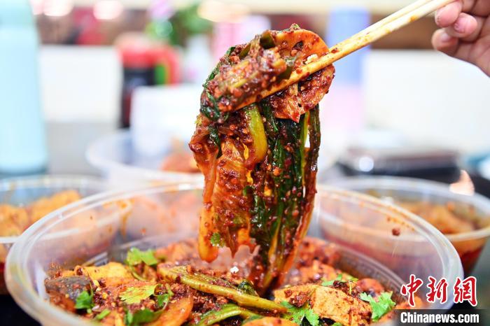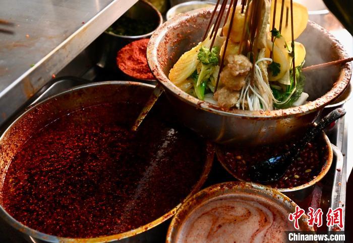 3月14日,甘肅省天水市秦州區(qū),食客展示裹滿(mǎn)紅油辣子的麻辣燙。九美旦增 攝