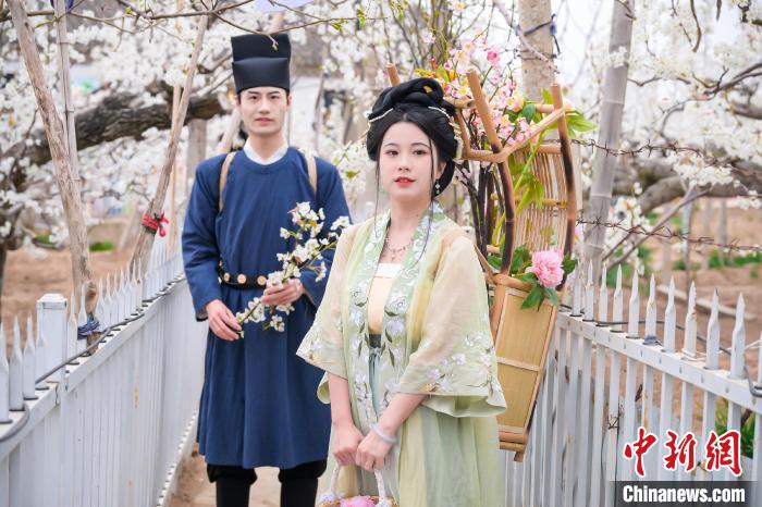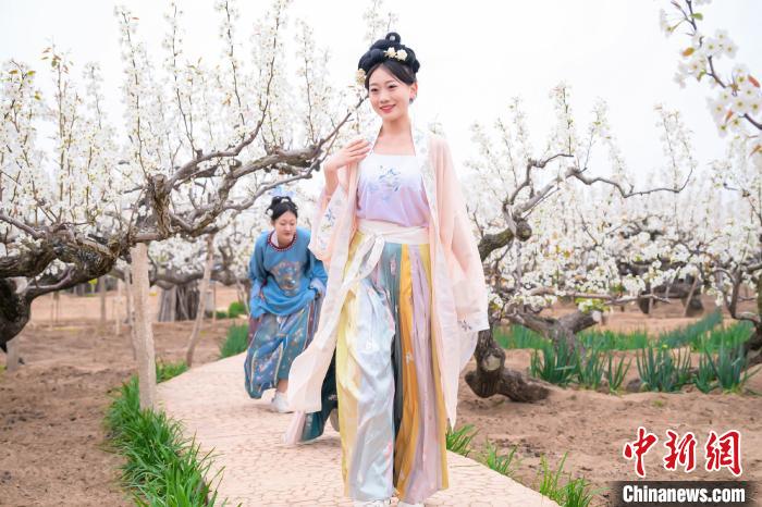 原標題:山東萊陽萬畝梨花惹人醉 民眾著古裝游園