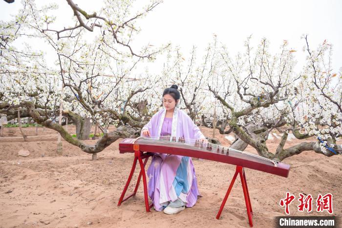 游客在梨園里彈古箏。紀欣宏 攝