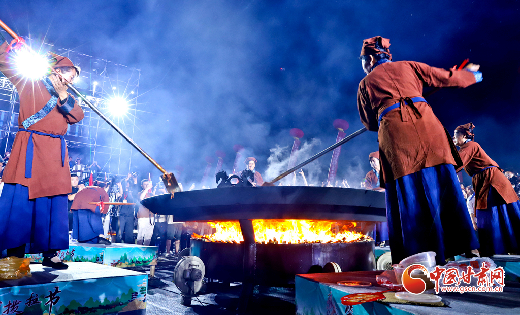 7月13日晚,甘肅省張掖市山丹縣智行廣場上, 一口直徑3.3米的大鏊展現(xiàn)在廣場中央,八名大廚揮動著鏟子奮力翻炒,將一碗碗絲路美食炒撥拉呈現(xiàn)在眾多游客面前。