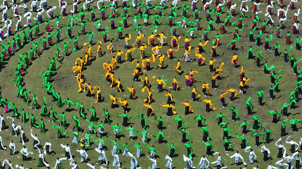 在歡快優(yōu)美的樂(lè)曲聲中,萬(wàn)人鍋莊開(kāi)始展演,動(dòng)聽(tīng)的樂(lè)曲、颯爽的舞姿、五彩的服裝,將甘南的生態(tài)之美、文化之美、民俗之美、和諧之美展示得淋漓盡致。圓圈形的鍋莊舞表達(dá)了甘南人民在中國(guó)共產(chǎn)黨領(lǐng)導(dǎo)下,各民族像石榴籽一樣緊緊擁抱在一起,為推動(dòng)甘南高質(zhì)量發(fā)展,畫(huà)出最大同心圓。