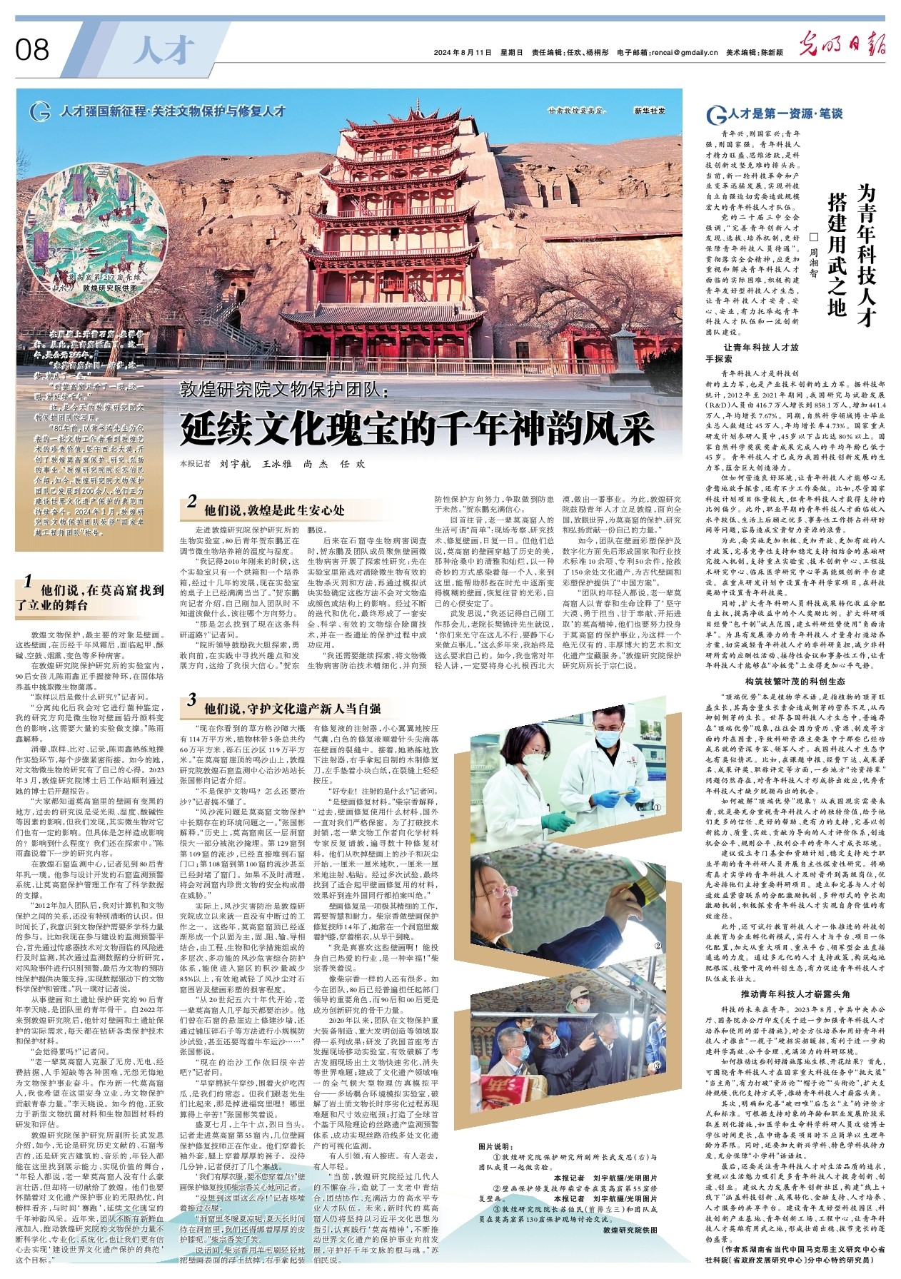 “團隊的年輕人都說,老一輩莫高窟人以青春和生命詮釋了‘堅守大漠、勇于擔當、甘于奉獻、開拓進取’的莫高精神,他們也要努力投身于莫高窟的保護事業(yè),為這樣一個絕無僅有的、豐厚博大的藝術和文化遺產(chǎn)寶藏服務。”敦煌研究院保護研究所所長于宗仁說。