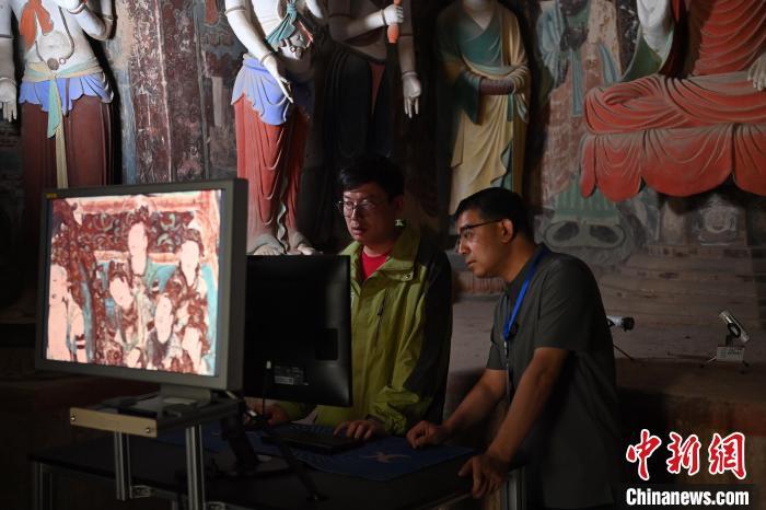 6月5日,敦煌莫高窟內(nèi),敦煌研究院文物數(shù)字化研究所工作人員進(jìn)行敦煌壁畫數(shù)字化圖像現(xiàn)場(chǎng)檢查工作。中新社記者 李亞龍 攝