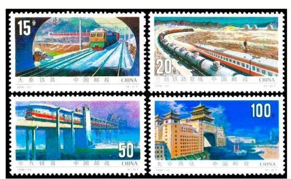 1996年9月,我國發(fā)行編號為1996-22的《鐵路建設(shè)》郵票一套四枚,其中T4-2圖為蘭新鐵路復(fù)線。票面上,一貨一客兩列火車蜿蜒在蘭新鐵路復(fù)線,氣勢如虹。而嘉峪關(guān)關(guān)城作為一個地理標(biāo)志,被處理成蘭新鐵路復(fù)線的背景圖案,放在郵票主圖的后方。盡管由于票面所限,背景圖案上的嘉峪關(guān)關(guān)城畫面很小,無以淋漓盡致地表現(xiàn)嘉峪關(guān)城樓的細節(jié),但其“天下第一雄關(guān)”的雄姿絲毫不減。而嘉峪關(guān)出現(xiàn)在表現(xiàn)甘肅特色乃至蘭新交通主線的票面上,也足見其地理位置的重要性。