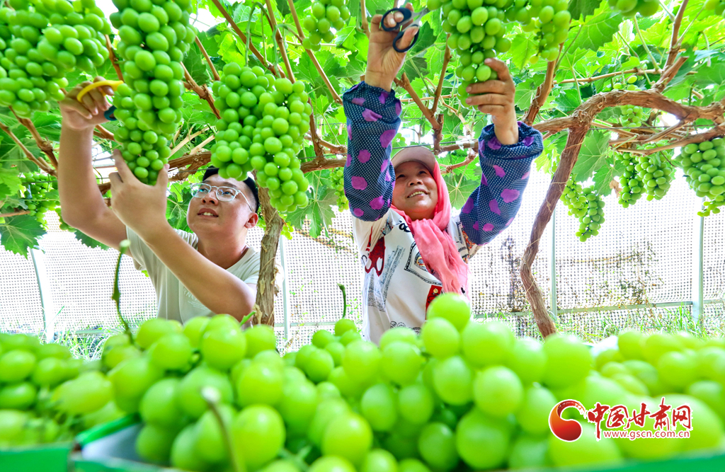 8月28日,在高臺(tái)縣南華鎮(zhèn)智號(hào)村1000畝陽光玫瑰葡萄綠色標(biāo)準(zhǔn)化產(chǎn)業(yè)園內(nèi),40多萬斤陽光玫瑰進(jìn)入成熟采摘期,果農(nóng)們正在采摘、分揀、裝箱,準(zhǔn)備發(fā)往浙江、江蘇、新疆、青海、內(nèi)蒙古等地客商的手中。
