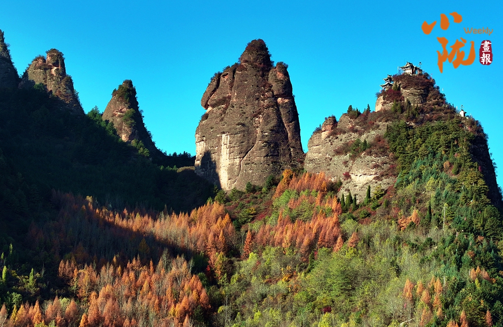 站在山頂,俯瞰四野,山勢挺拔,直插云霄,山巒被紅、黃、橙、綠各種顏色渲染,盡顯山巒疊翠之美。