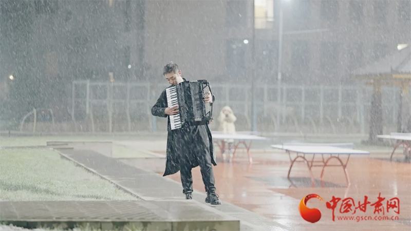鏡頭中,在蘭州大學(xué)榆中校區(qū),手風琴聲伴隨著雪花,一位同學(xué)在雪中輕輕擺動著身體,引得過路的同學(xué)駐足欣賞。