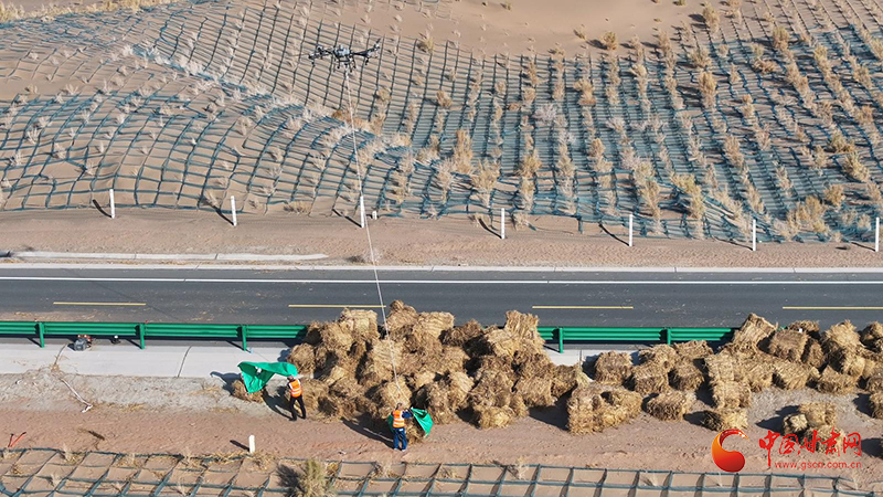 防沙治沙又一季,綠化造林年復(fù)年。這幾天,在金塔縣城至大墩門公路“三北”工程防沙治沙現(xiàn)場(chǎng),一捆捆稻草正排著隊(duì)乘坐無(wú)人機(jī)前往沙漠深處。走進(jìn)壓沙現(xiàn)場(chǎng),大家拉草埋沙,手提肩扛,或俯身鋪草,或揮鍬壓埋、填沙整型,分工明確、干勁十足。一臺(tái)壓沙車正在作業(yè),車輪駛過(guò),稻草沙障便被植入沙漠里,劃線、鋪草、壓草,整個(gè)流程一氣呵成,效率大大提高。