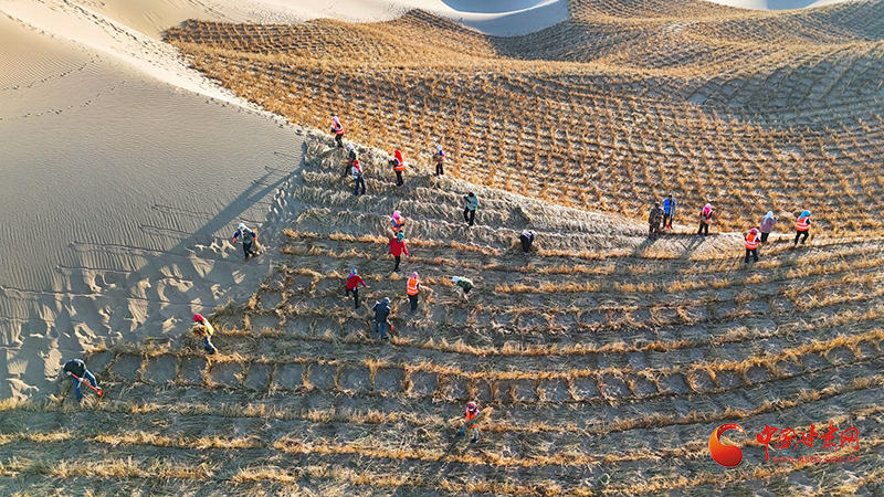 據(jù)了解,金塔縣黑河中游防沙治沙林草綜合治理項(xiàng)目,今年計(jì)劃給1174畝沙漠戴上草方格“圍脖”,工期50天,預(yù)計(jì)需要稻草410噸。隨著治沙進(jìn)度的加快,一個(gè)個(gè)草方格沙障從無(wú)到有漸次鋪開,猶如一條條金色的“鎖鏈”,牢牢鎖住沙丘,在茫茫沙海筑起了一道道生態(tài)安全屏障。當(dāng)下正值農(nóng)閑時(shí)節(jié),該項(xiàng)目通過(guò)“以工代賑”,改變了傳統(tǒng)做法,通過(guò)有償勞動(dòng)讓群眾由治沙的“看客”變?yōu)橹紊车?ldquo;主角”,構(gòu)建起全民參與防沙治沙新格局,實(shí)現(xiàn)治沙致富雙贏,預(yù)計(jì)增加群眾收入3000余萬(wàn)元。