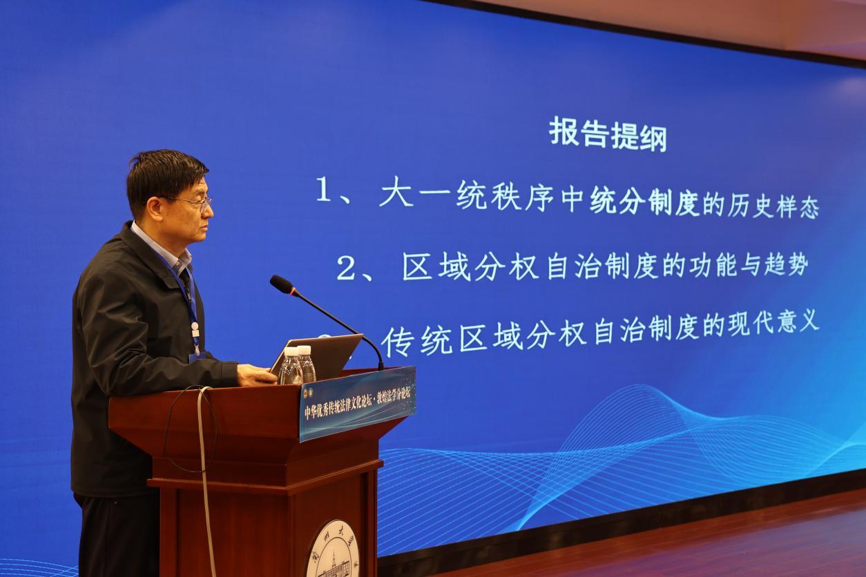 中國社會科學院法學研究所二級研究員、博士生導師、法制史研究室主任、中國法律史學會會長、第七屆“全國十大杰出青年法學家”張生,從大一統(tǒng)秩序中統(tǒng)分制度的歷史樣態(tài)、區(qū)域分權(quán)自治制度的功能與趨勢、傳統(tǒng)區(qū)域分權(quán)自治制度的現(xiàn)代意義等方面作了題為“大一統(tǒng)秩序下的統(tǒng)分制度及其現(xiàn)代意義”的主旨報告。