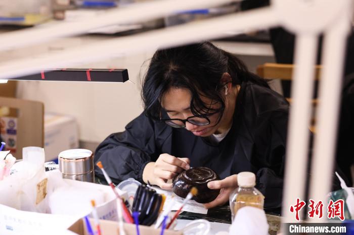 11月27日,南昌漢代?;韬顕?guó)遺址博物館的漆器修復(fù)室內(nèi),文物修復(fù)師正在修復(fù)一件漆器?!⑺紓?nbsp;攝