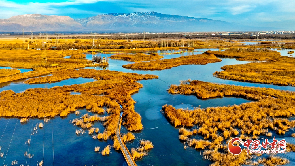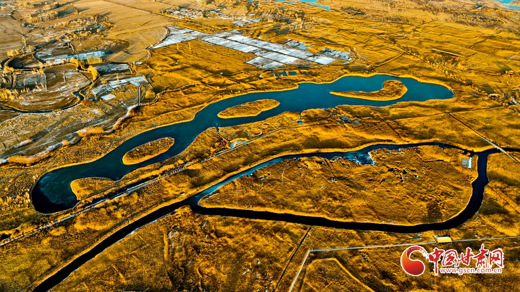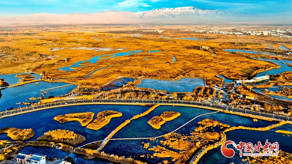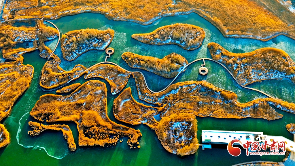 12月1日,俯瞰甘肅張掖國家濕地公園,夕陽余暉映照,金色茂密的蘆葦隨風搖曳,蘆花翩翩起舞,碧波蕩漾的水面逐漸凝結成冰,整個濕地化作一片金色的童話仙境,令人陶醉于無盡的遐想之中。