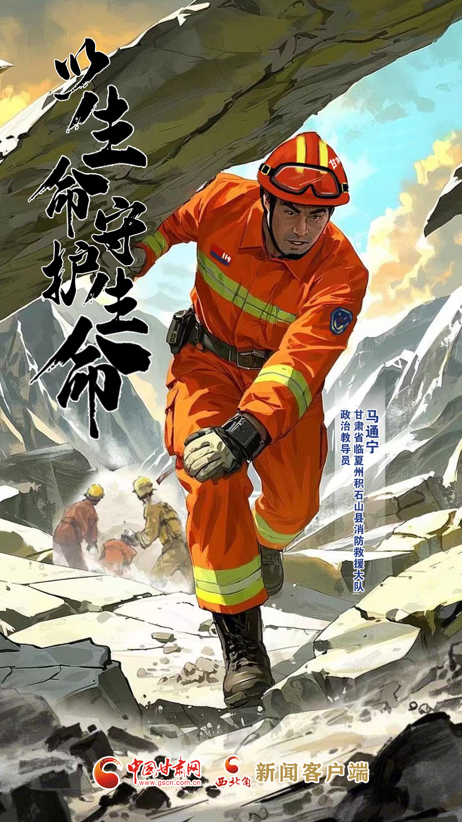 手繪海報|甘肅省臨夏州積石山縣消防救援大隊政治教導員馬通寧:以生命守護生命