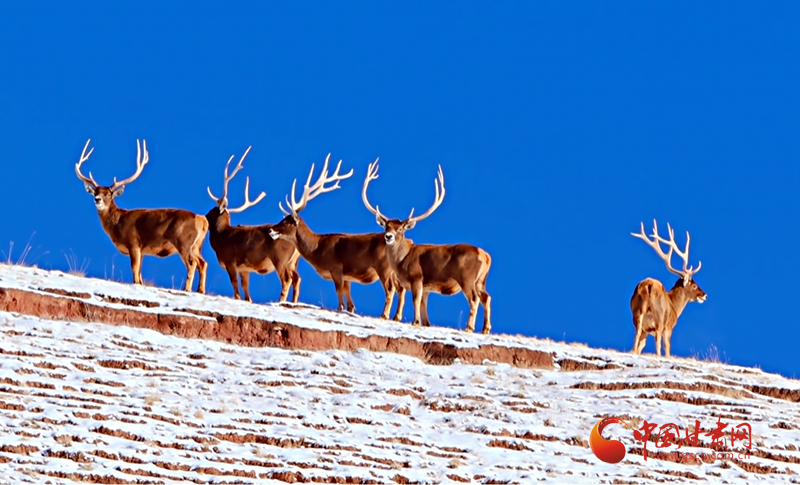 畫面顯示,在白雪皚皚的祁連山之上,五只白唇鹿駐足停留,仿佛也在欣賞祁連山美景,這些白唇鹿體態(tài)壯碩、動(dòng)作靈活,在鹿群“首領(lǐng)”的帶領(lǐng)下越過山坡,前往下一個(gè)覓食地。